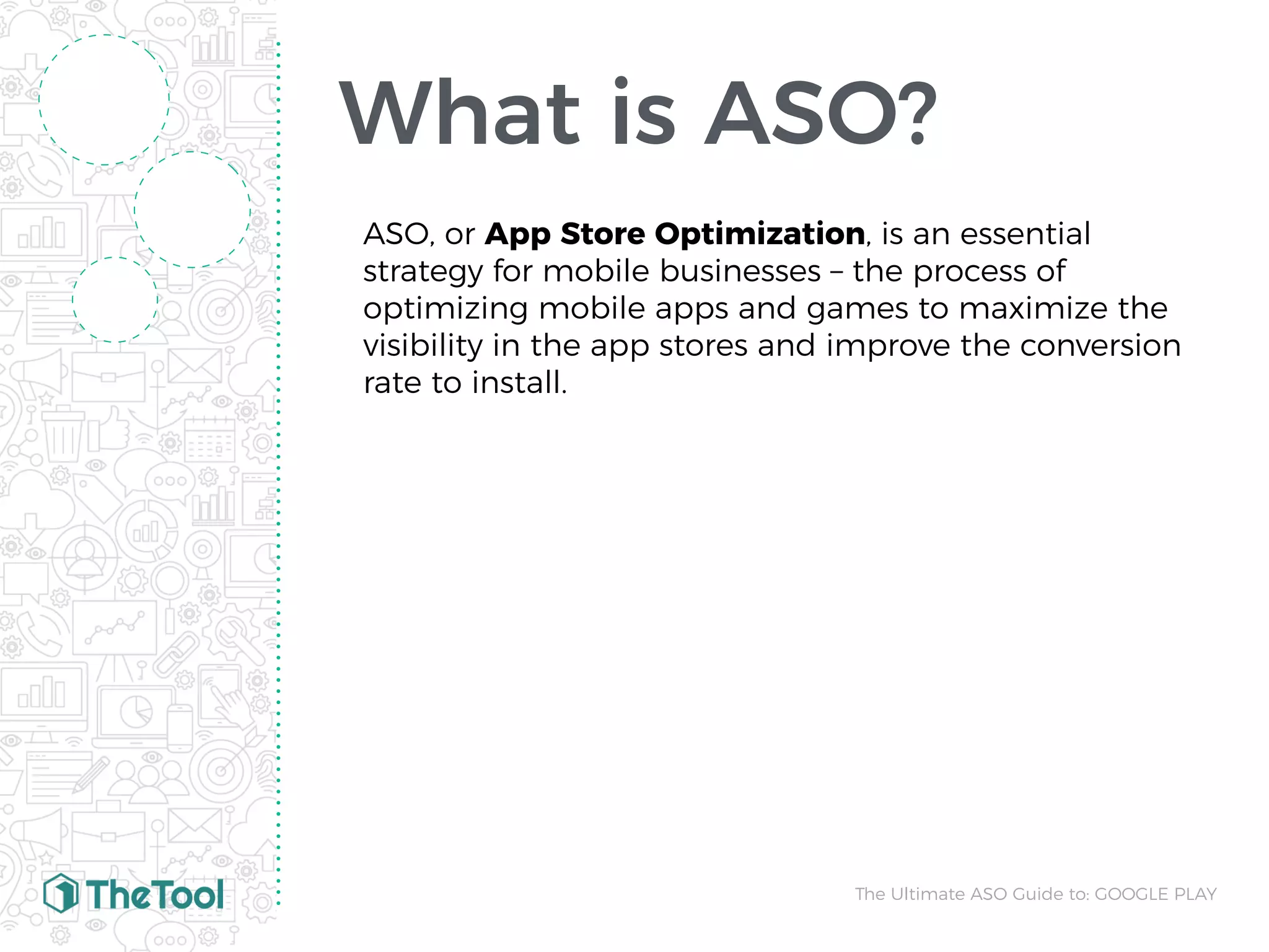 The document outlines the essential components of App Store Optimization (ASO) for Google Play, emphasizing three main processes: market research and keyword optimization, listing optimization through A/B testing, and ongoing tracking and monitoring. Key strategies include selecting long-tail keywords, optimizing app titles and descriptions, creating compelling visuals (icons and screenshots), and utilizing user reviews to enhance app visibility and conversion rates. Regular performance tracking and A/B testing are recommended to adapt to changing market conditions and user preferences.