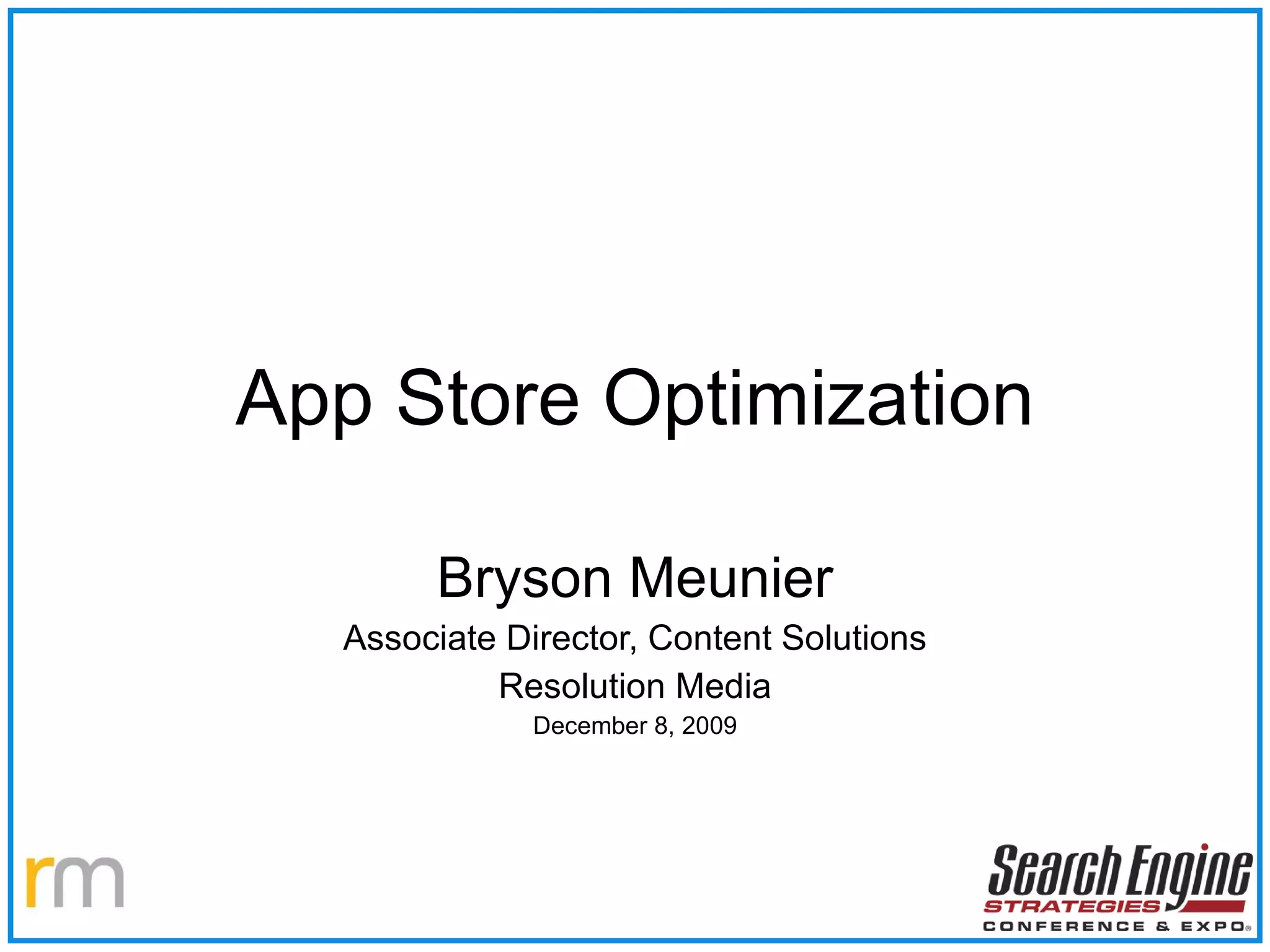 This document provides tips and strategies for optimizing apps in the App Store to increase visibility and downloads. It discusses getting apps properly indexed and cataloged, making app content relevant for searches, and marketing apps to make relevant users aware. Key recommendations include using relevant keywords, integrating social media, offering free versions, encouraging reviews, and promoting apps on websites and to relevant communities. Analytics can also help optimize app performance.