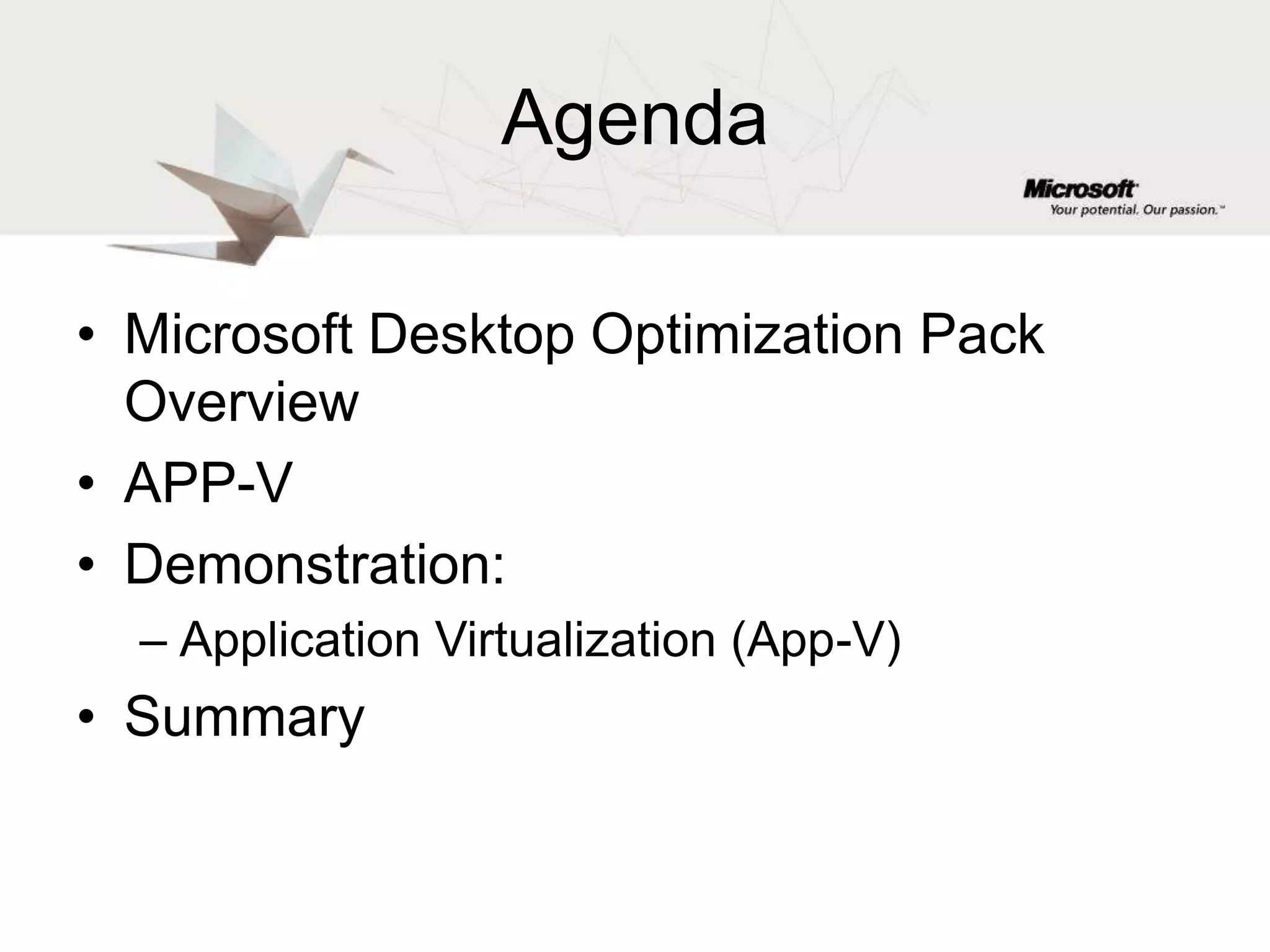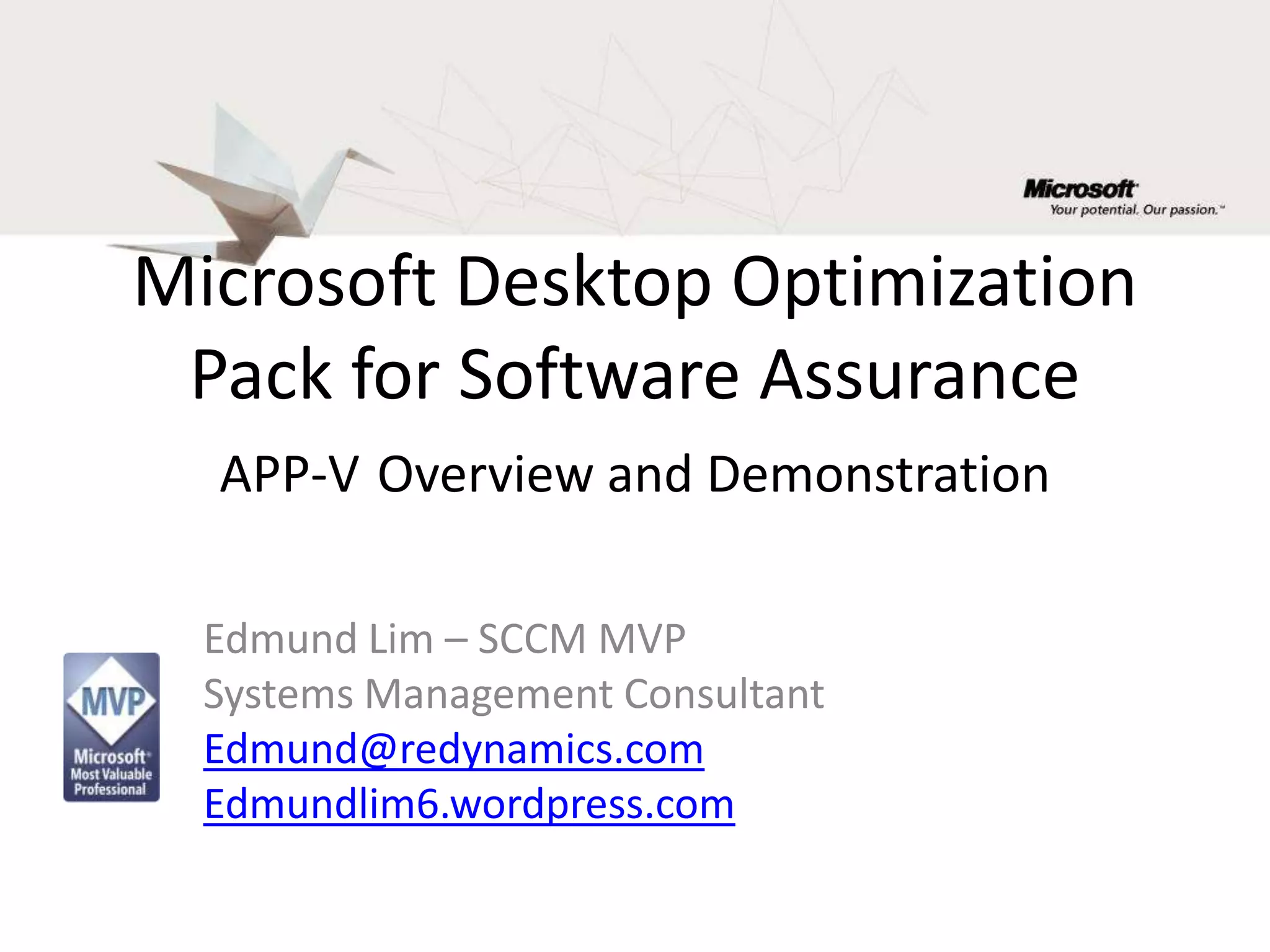This document provides an overview of the Microsoft Desktop Optimization Pack (MDOP), specifically the Application Virtualization (App-V) component. It discusses how App-V allows applications to run without being installed locally, eliminating compatibility issues between different application versions running on the same machine. The document demonstrates how App-V can publish virtualized applications that appear on the desktop like normally installed applications. It also shows how App-V enables different versions of Java to be used by different applications and allows desktop sharing by only showing users their assigned applications.