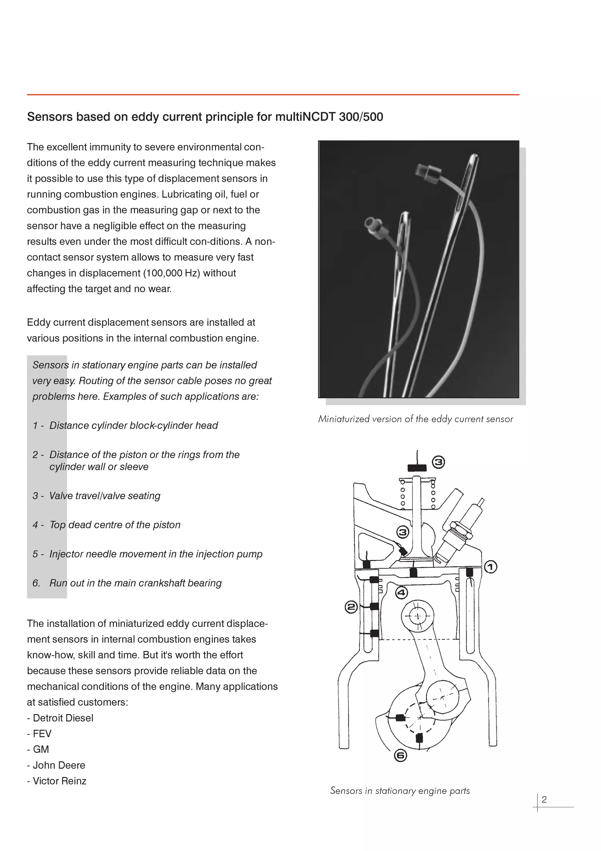 Eddy current displacement sensors are well-suited for measuring displacement, position, and gaps inside internal combustion engines under real operating conditions. Miniaturized eddy current sensors have been customized and installed at various engine locations, such as between the piston and cylinder wall, to measure thermal and mechanical stresses during normal running and motored operation. The non-contact sensors provide reliable data even in harsh engine environments with high temperature, pressure, vibrations, and contaminants.