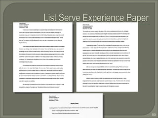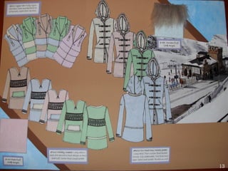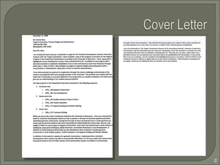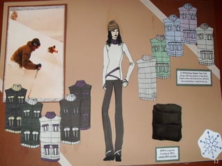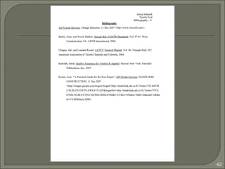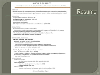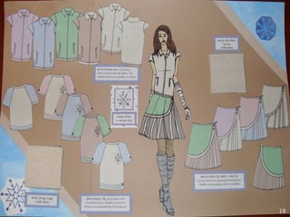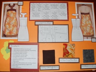 This portfolio document summarizes Alicia Schmidt's apparel design work from 2006-2008. It includes samples of her coursework, construction projects, technical specifications for garments she designed, as well as packaging and shipping details. The portfolio showcases her skills in apparel construction, patternmaking, grading, and technical design through both individual and group classroom projects.