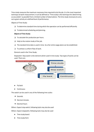 The document provides information on work study, time study, and motion study techniques used to improve productivity in manufacturing. It discusses the objectives of work study as improving efficiency, reducing costs, and optimizing resource use. Time study measures the necessary time to complete a job, while motion study analyzes body movements to improve performance. The document also provides examples of calculating standard minute value and setting production targets using time study data.