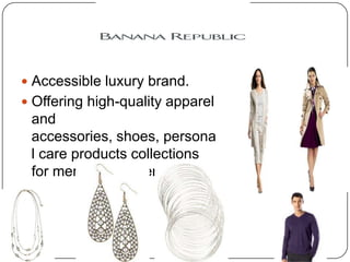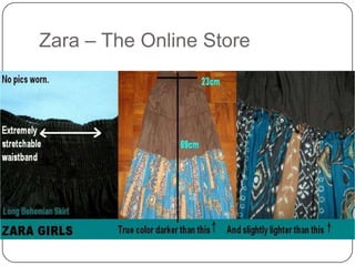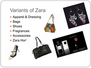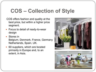 H&M is a major global clothing retailer known for offering fashion and quality at affordable prices. It operates stores in 35 markets worldwide and has over 1,988 stores and 76,000 employees. Other brands owned by H&M include COS, Monki, Weekday, and Cheap Monday. Zara is a major clothing brand owned by Spanish company Inditex. Zara designs, produces, and distributes its clothing itself, launching around 10,000 new designs each year within just 4-5 weeks. It has over 1,600 stores in 74 countries. Both H&M and Zara are known for their fast fashion model and focusing on trendy and affordable apparel.