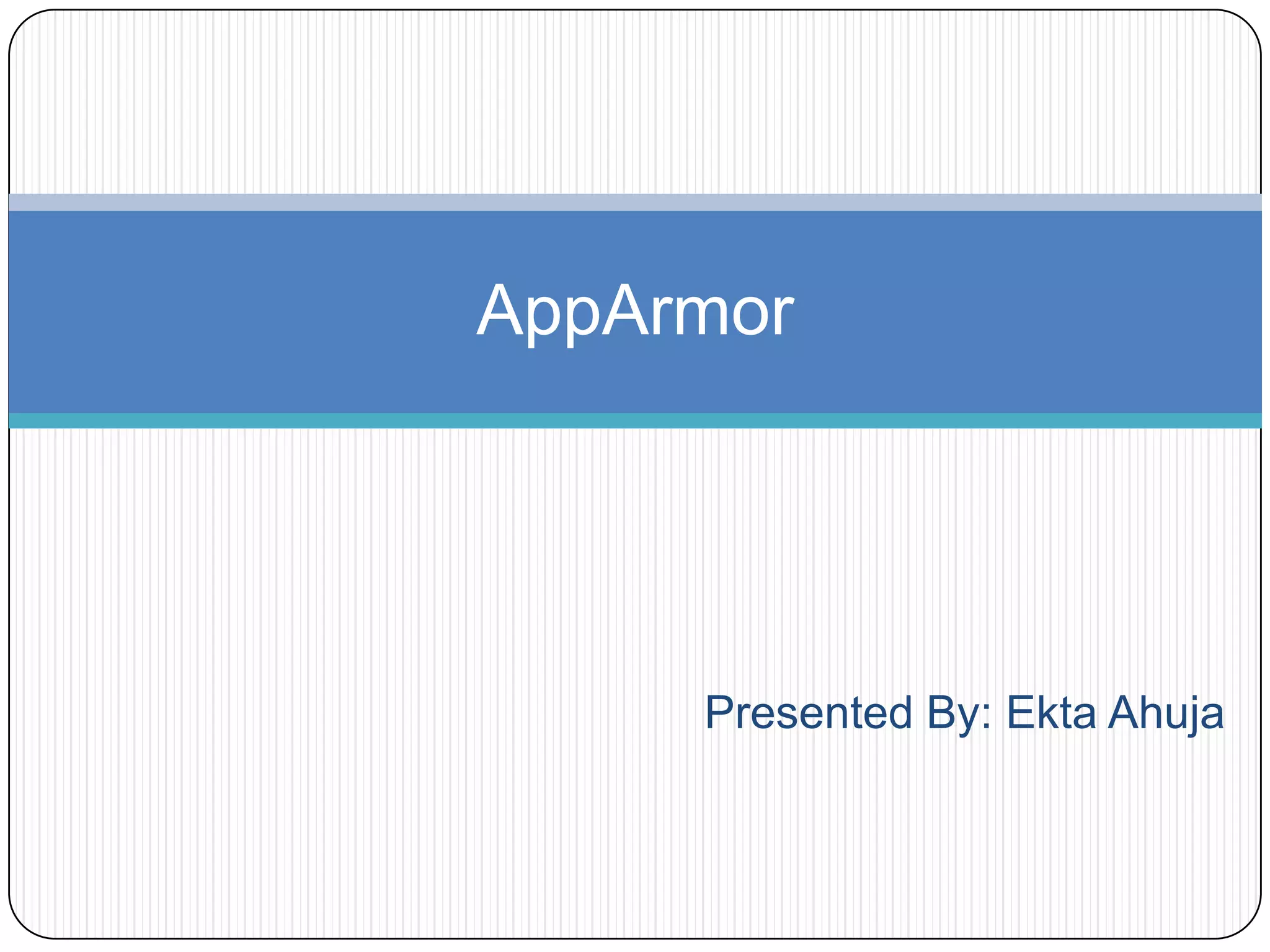 The document discusses AppArmor, a security framework that protects Linux systems and applications from external threats by enforcing good program behavior and access privileges. It can generate profiles for individual programs that define allowed system resources and privileges. Profiles include rules for filesystem access, capabilities, and network access. The document provides an example profile and discusses profile types, generation, and modes like enforce and complain that are used to test and implement profiles.