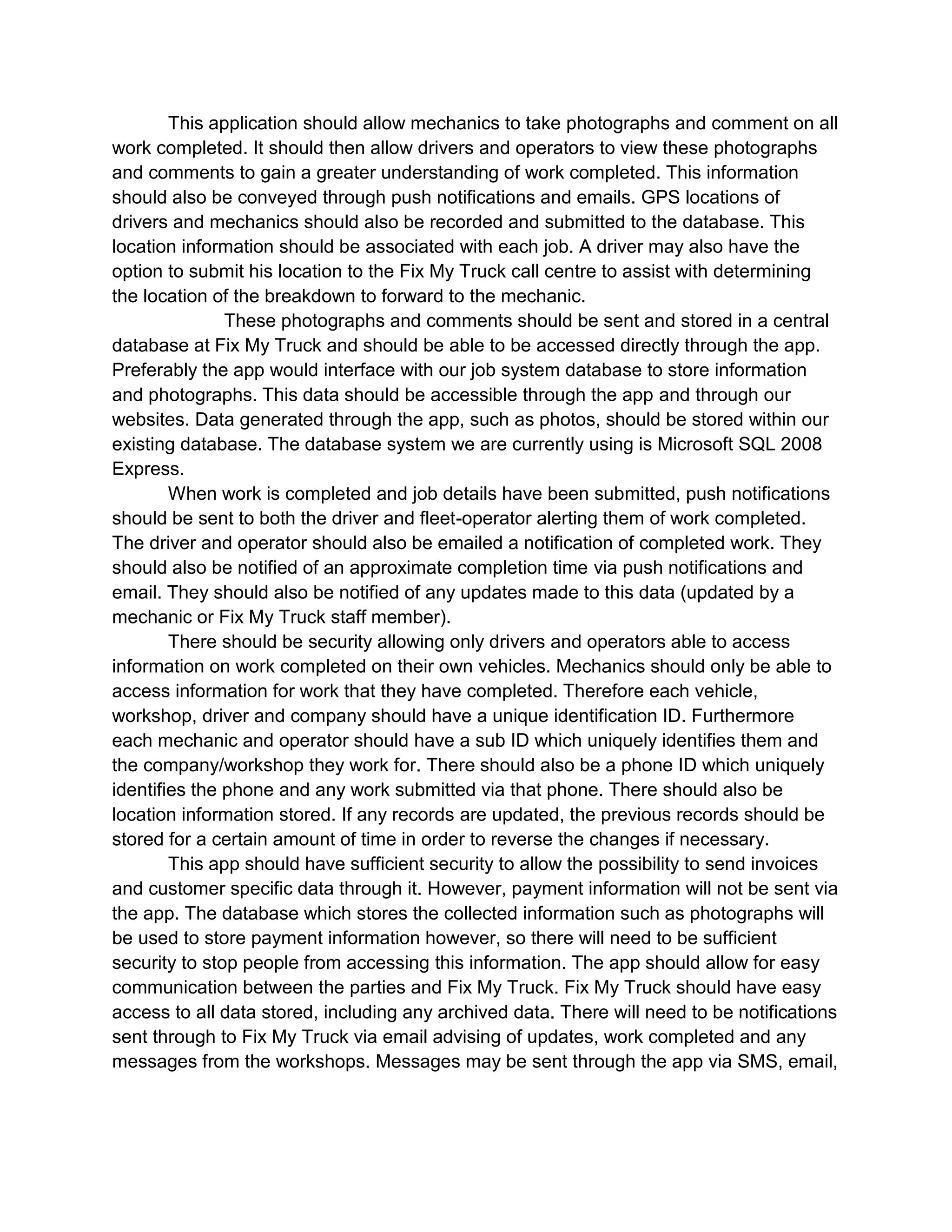 The document provides an overview of an app development proposal for Fix My Truck Pty Ltd. The app would allow mechanics, customers, and Fix My Truck to communicate about vehicle repairs and maintenance records. Mechanics could upload photos, comments, and job details to a central database accessed via the app. Customers and Fix My Truck would receive notifications when jobs are completed. The app requires secure login, data storage, and interfaces with Fix My Truck's existing databases. Future additions could enable invoices, messaging between parties, and location tracking to improve services.