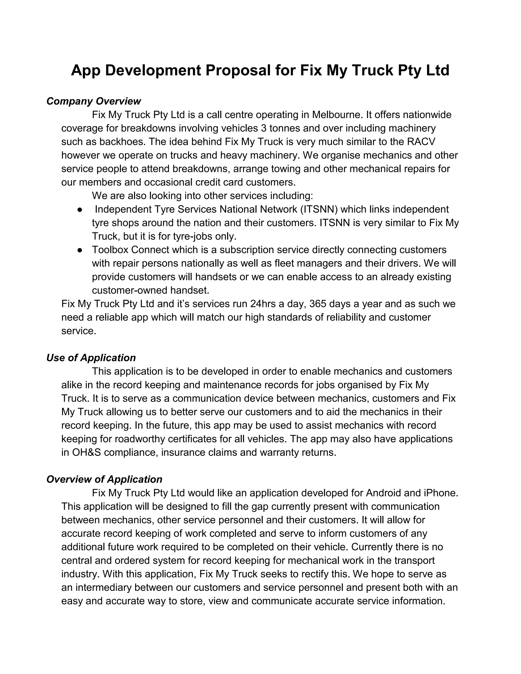 The document provides an overview of an app development proposal for Fix My Truck Pty Ltd. The app would allow mechanics, customers, and Fix My Truck to communicate about vehicle repairs and maintenance records. Mechanics could upload photos, comments, and job details to a central database accessed via the app. Customers and Fix My Truck would receive notifications when jobs are completed. The app requires secure login, data storage, and interfaces with Fix My Truck's existing databases. Future additions could enable invoices, messaging between parties, and location tracking for safety compliance.