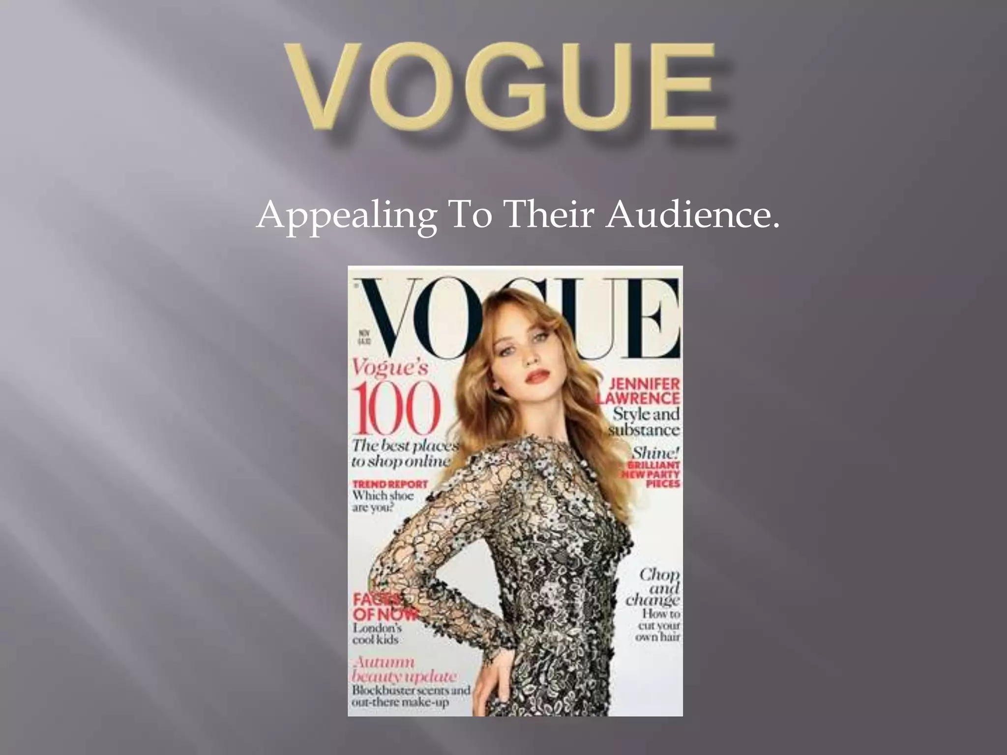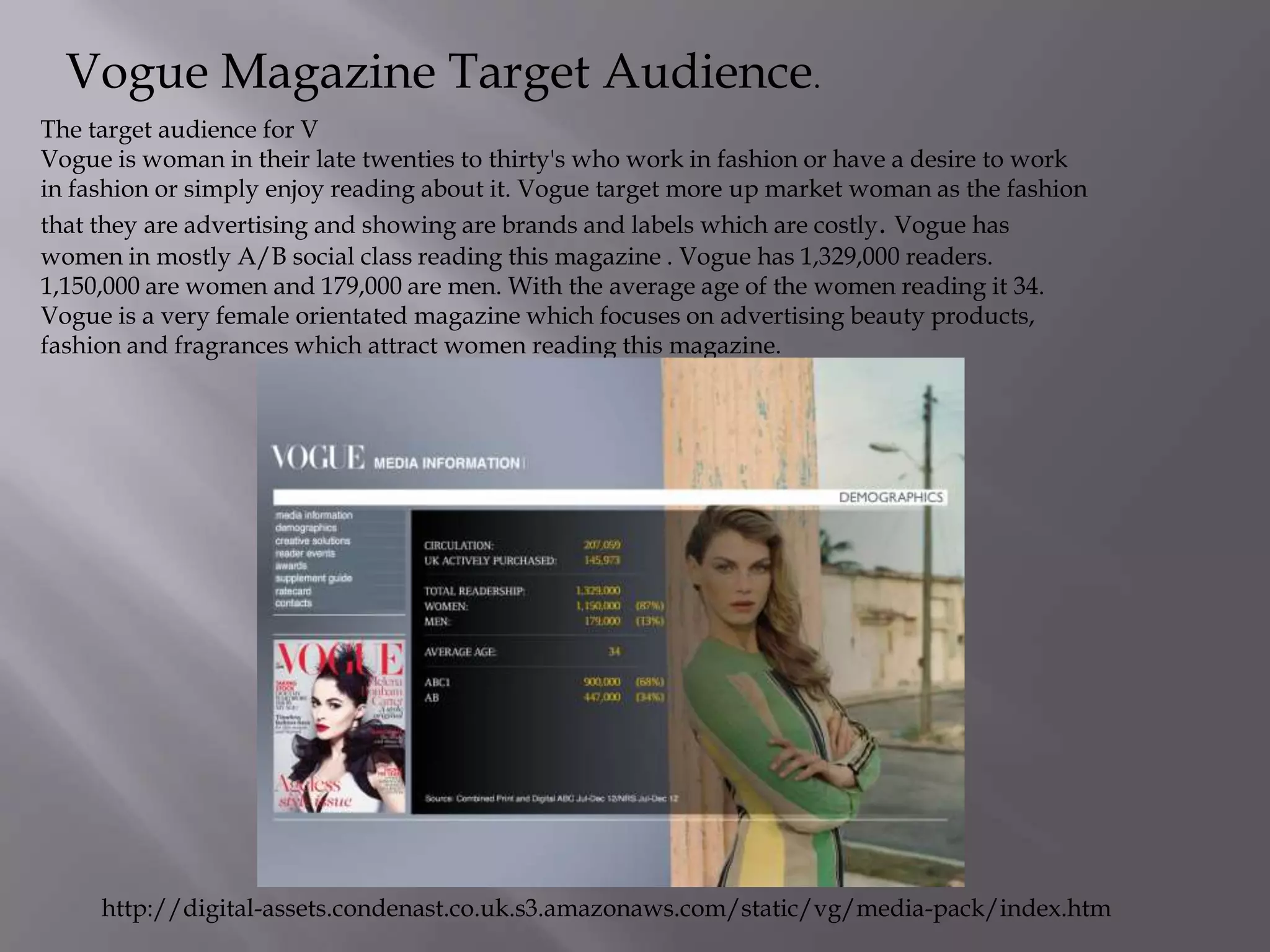 Vogue magazine targets women aged late 20s to 30s who work in or have an interest in fashion. It focuses on advertising high-end beauty, fashion, and fragrance brands. Images on the cover and inside use bright colors and professional photography to attract readers and showcase fashion trends. The writing style is formal yet approachable to match the educated, fashion-conscious target audience. Formats like fonts, layouts, and levels of text versus images follow magazine conventions to effectively engage readers.