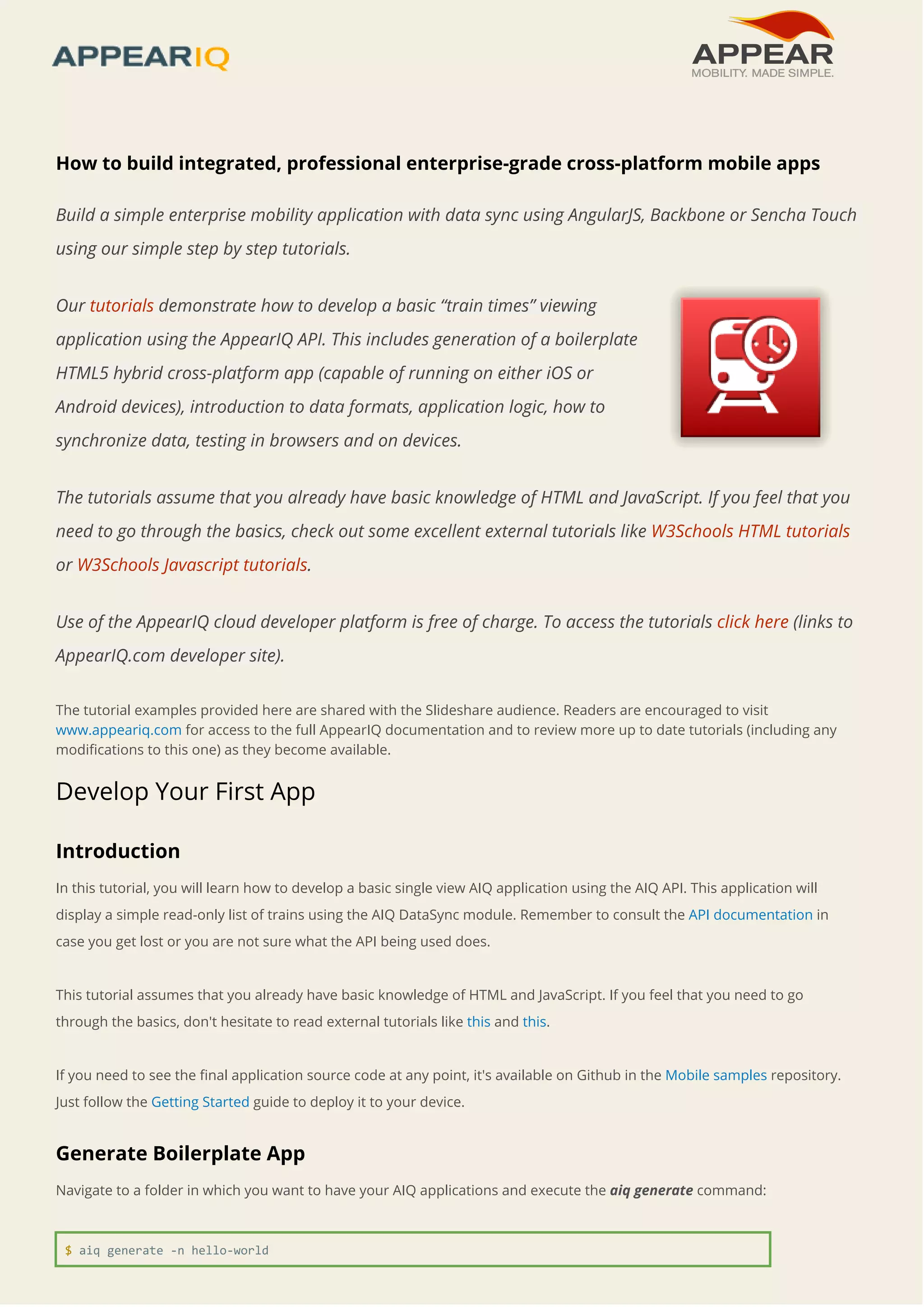This document provides a step-by-step tutorial on how to build a cross-platform mobile application using the Appeariq API with technologies like AngularJS and Backbone. It covers generating a boilerplate application, configuring data synchronization, and the necessary HTML structure, while assuming basic knowledge of HTML and JavaScript. The tutorial concludes with instructions for testing the app both in a web browser and on mobile devices.