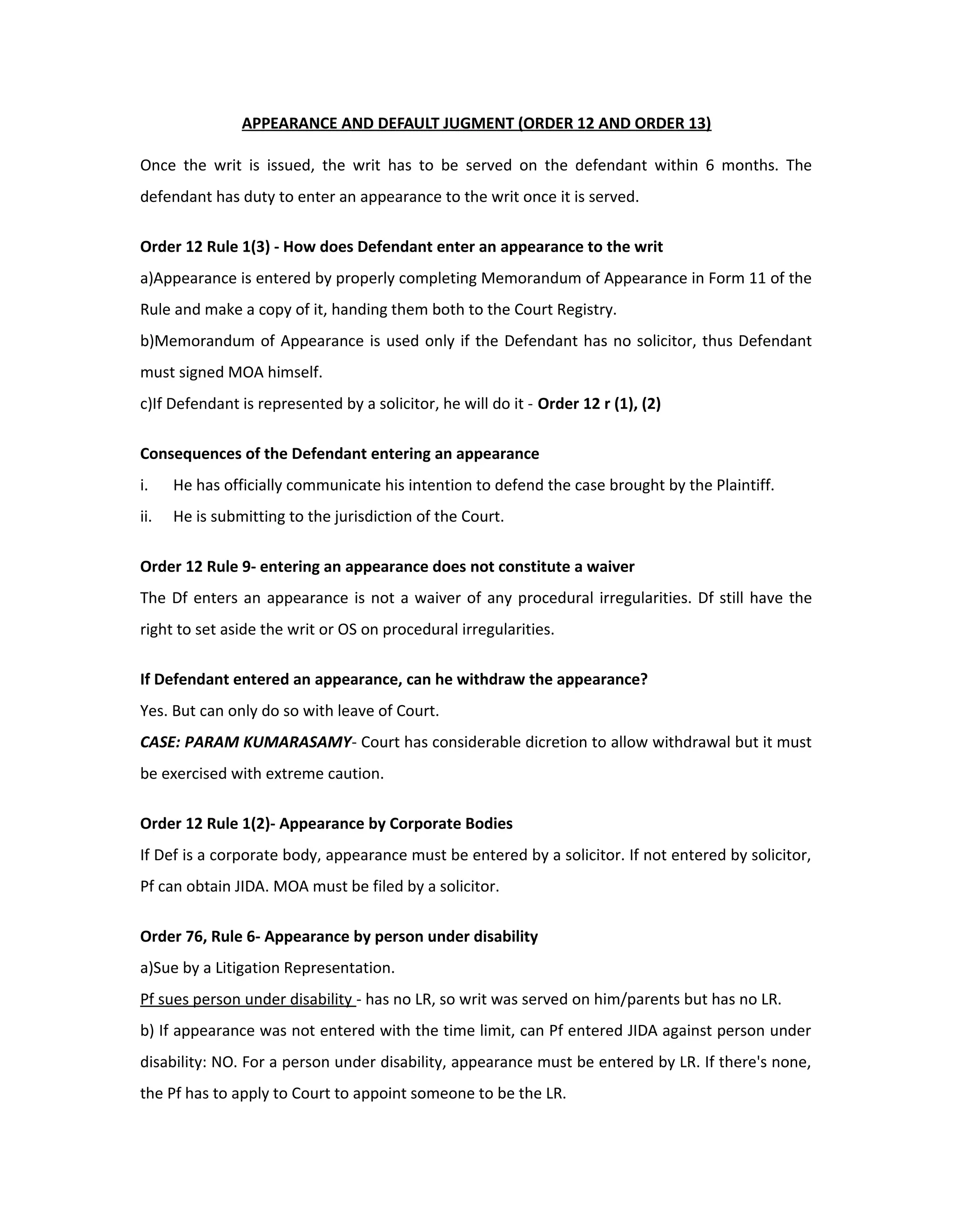The document discusses the procedures for entering an appearance and obtaining a judgment in default of appearance (JIDA) under Malaysian civil procedure rules.