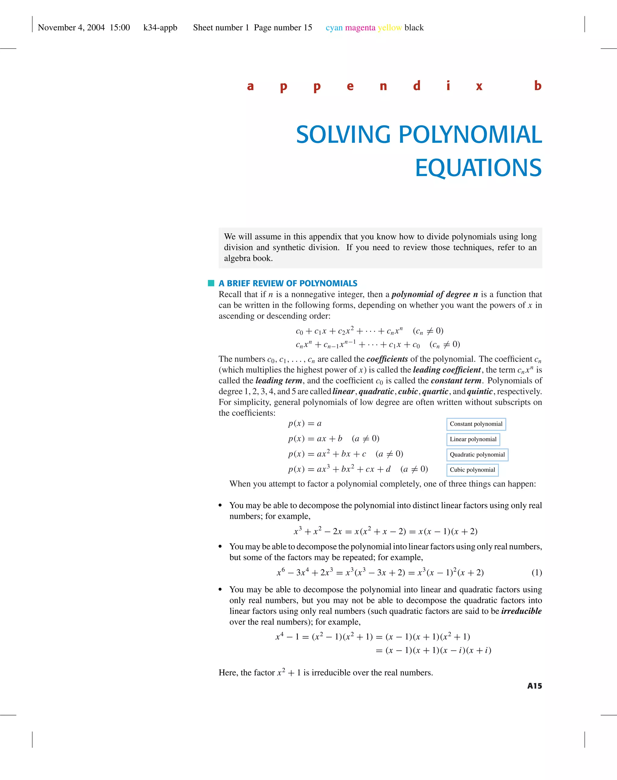 This document provides an overview of solving polynomial equations. It defines polynomials and their key properties like degree, coefficients, and roots. It introduces several theorems for finding roots, including the Remainder Theorem, Factor Theorem, and the idea that a polynomial of degree n has n roots when counting multiplicities. Methods discussed include factoring, long division, and the quadratic formula. The document explains it is not possible to express solutions of polynomials of degree 5 or higher using radicals.