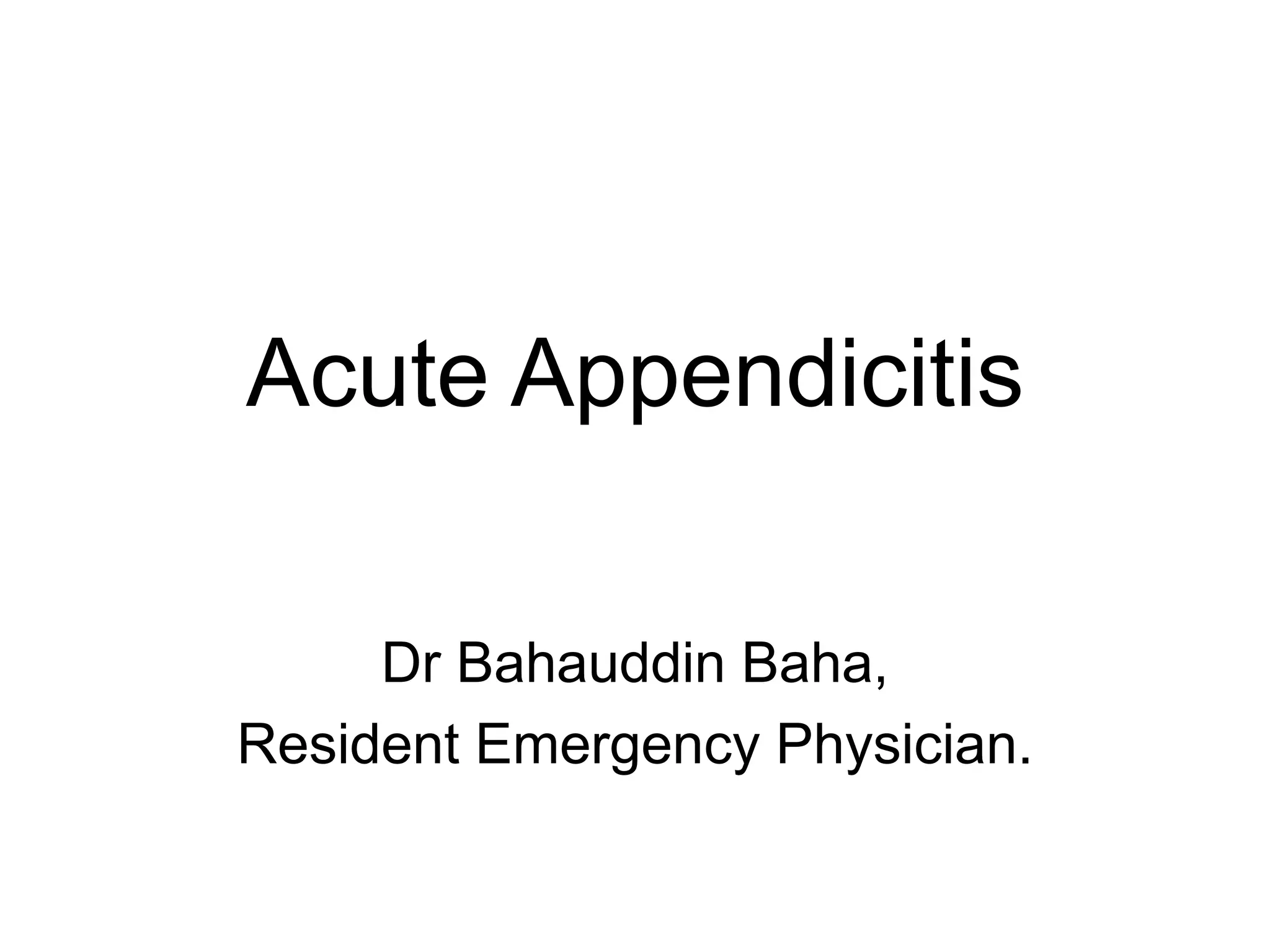 Acute appendicitis is caused by luminal obstruction of the vermiform appendix, most commonly by a fecalith. Clinical features include periumbilical or right lower quadrant pain, anorexia, nausea, and tenderness in the right lower quadrant. The Alvarado score is used to determine the likelihood of appendicitis and need for imaging or surgical consultation. For patients presenting with suspected appendicitis, ultrasound is usually the initial imaging choice, while CT is also effective for diagnosis. Surgery is the standard treatment for confirmed acute appendicitis.