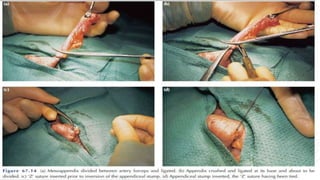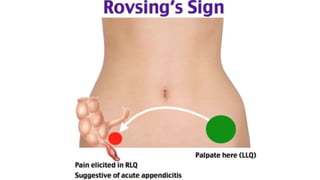 Appendicitis is an inflammation of the vermiform appendix. The appendix is typically 10 cm long and located at the base of the caecum. It receives its blood supply from the appendicular artery. Symptoms of appendicitis include sudden pain in the lower right abdomen that shifts locations, nausea, vomiting, and fever. Diagnosis is based on symptoms and signs like rebound tenderness. Treatment involves intravenous antibiotics and analgesics initially, and an appendectomy if symptoms worsen or do not improve. Complications can include rupture, abscess formation, or infection spread.