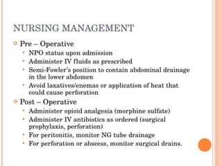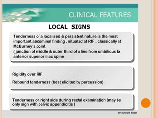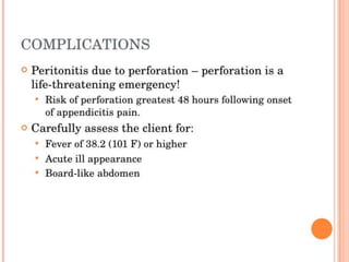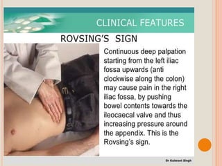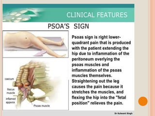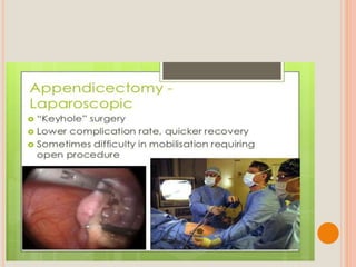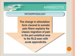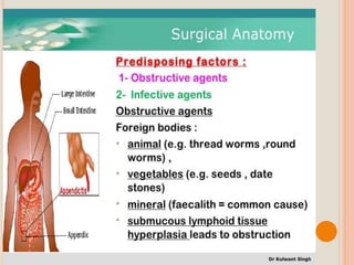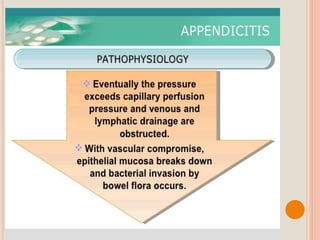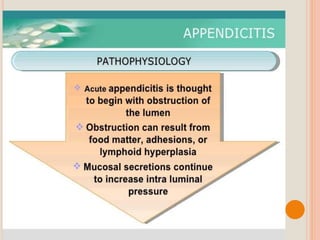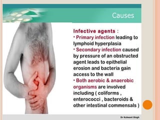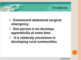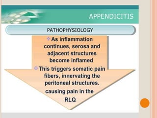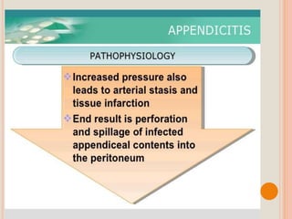 This document presents a case study of a 35-year-old male farmer, Mr. Namdev J. Kokate, who was admitted to the hospital with a chief complaint of abdominal pain, nausea, and vomiting for the past 5 days. Upon examination and testing, he was diagnosed with acute appendicitis. His history, physical exam findings, lab results, and ultrasound results are documented. He received IV antibiotics and analgesics for treatment and underwent an appendectomy surgery. The case presentation covers his medical history, physical assessment, diagnostic workup, treatment plan, and nursing care.