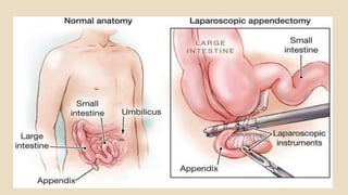 Appendicitis is an inflammation of the appendix that most commonly affects adolescents and young adults. It is usually caused by a blockage in the appendix from items like stool or parasites. Common symptoms include abdominal pain localized to the lower right side of the abdomen. A physical exam may reveal tenderness at McBurney's point. Blood tests and imaging scans can help confirm the diagnosis. Treatment involves antibiotics and surgical removal of the appendix (appendectomy) to prevent rupture. Nursing care focuses on relieving pain, preventing infection and complications, and ensuring proper recovery post-operation.
