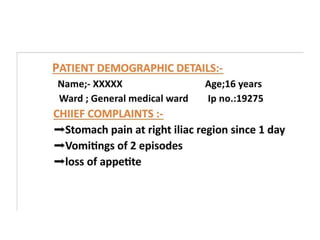 The patient presented with stomach pain, vomiting and loss of appetite for 1 day. Ultrasound showed a dilated and tender appendix. The patient was diagnosed with appendicitis and underwent an appendectomy. Post-surgery, the patient was prescribed medications including pantoprazole to decrease acid, ondansetron for nausea, cefaperazone/sulbactam and metronidazole for infection treatment, and diclofenac for pain. The patient's vital signs and lab tests were monitored daily and found to be stable and within normal ranges.