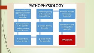 Appendicitis is inflammation of the appendix, which is usually caused by blockage. It can be acute or chronic. Symptoms include abdominal pain, fever, nausea, and tenderness near the appendix. Diagnosis involves examination, blood tests, ultrasound, and CT scan. Treatment is medical management with antibiotics and analgesics, or surgical removal of the appendix. Nursing care focuses on monitoring for complications, managing pain, and maintaining fluid balance.