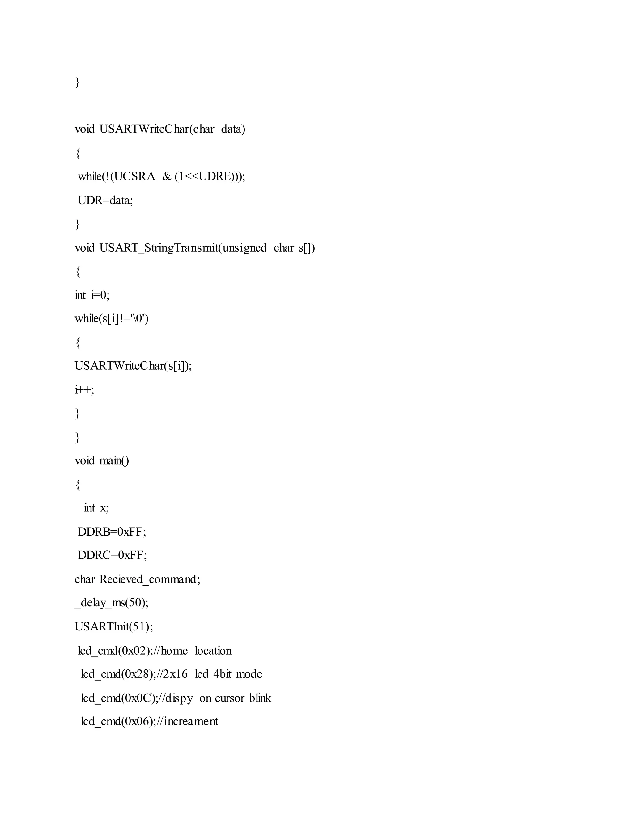 This document contains code for an Arduino project that controls home appliances like lights and fans using Bluetooth. It initializes the USART for Bluetooth communication, defines functions for sending commands to an LCD display and controlling outputs on ports B and C. When a number from 1-8 is received over Bluetooth, it will turn on different combinations of lights and fans on port C and display the status on the LCD.