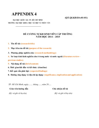APPENDIX 4 (QT.QLKH-DA-01-01) ĐẠI HỌCQUỐC GIA TP. HỒ CHÍ MINH TRƯỜNG ĐẠI HỌC KHOA HỌC XÃ HỘI VÀ NHÂN VĂN _______________________________ ĐỀ CƯƠNG NCKH SINH VIÊN CẤP TRƯỜNG NĂM HỌC 2014 – 2015 1. Tên đề tài: (research title) 2. Mục tiêu của đề tài:(purpose of the research) 3. Phương pháp nghiên cứu: (research methodology) 4. Sơ lược tình hình nghiên cứu ở trong nước và nước ngoài:(literature review - previous studies) 5. Nội dung đề tài:(briefcontent) 6. Thời gian bắt đầu và kết thúc: (timeline) 7. Kết quả cần phải đạt: (expected findings) 8. Hướng ứng dụng và địa chỉ áp dụng: (significance, implicationand application) TP. Hồ Chí Minh, ngày……. tháng…….năm 20….. Giáo viên hướng dẫn Chủ nhiệm đề tài (Ký và ghi rõ họ tên) (Ký và ghi rõ họ tên)