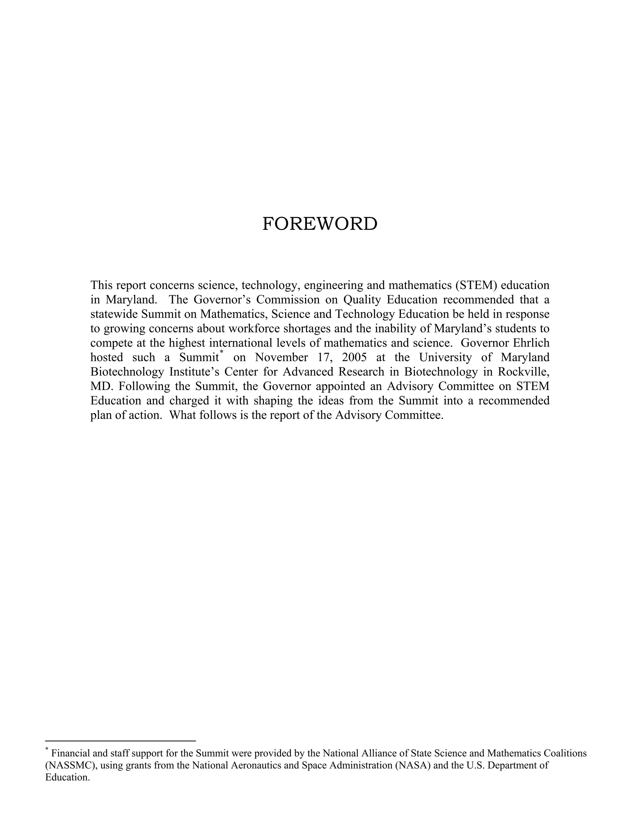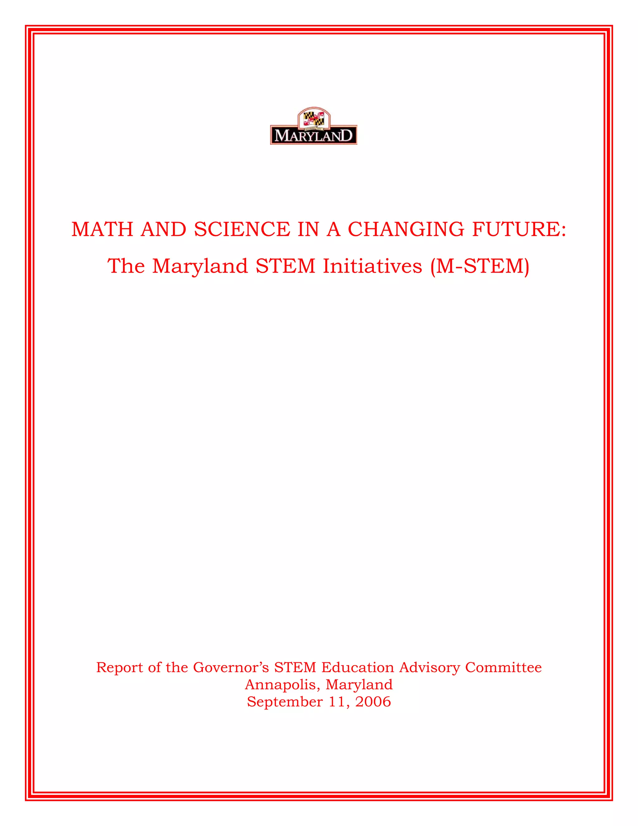 This document provides a summary of the report from the Governor's STEM Education Advisory Committee in Maryland. The report makes recommendations to strengthen STEM education in the state. It recommends three major initiatives: 1) Raising academic standards in math, science, and requiring 4 years each of math and science for graduation. 2) Improving teacher training and support. 3) A public awareness campaign about STEM education. It also recommends creating a new Maryland Institute of STEM Education to coordinate these efforts and conduct research to inform policy. A key recommendation is a large-scale pilot project to raise math achievement to world-class levels using an imported curriculum.