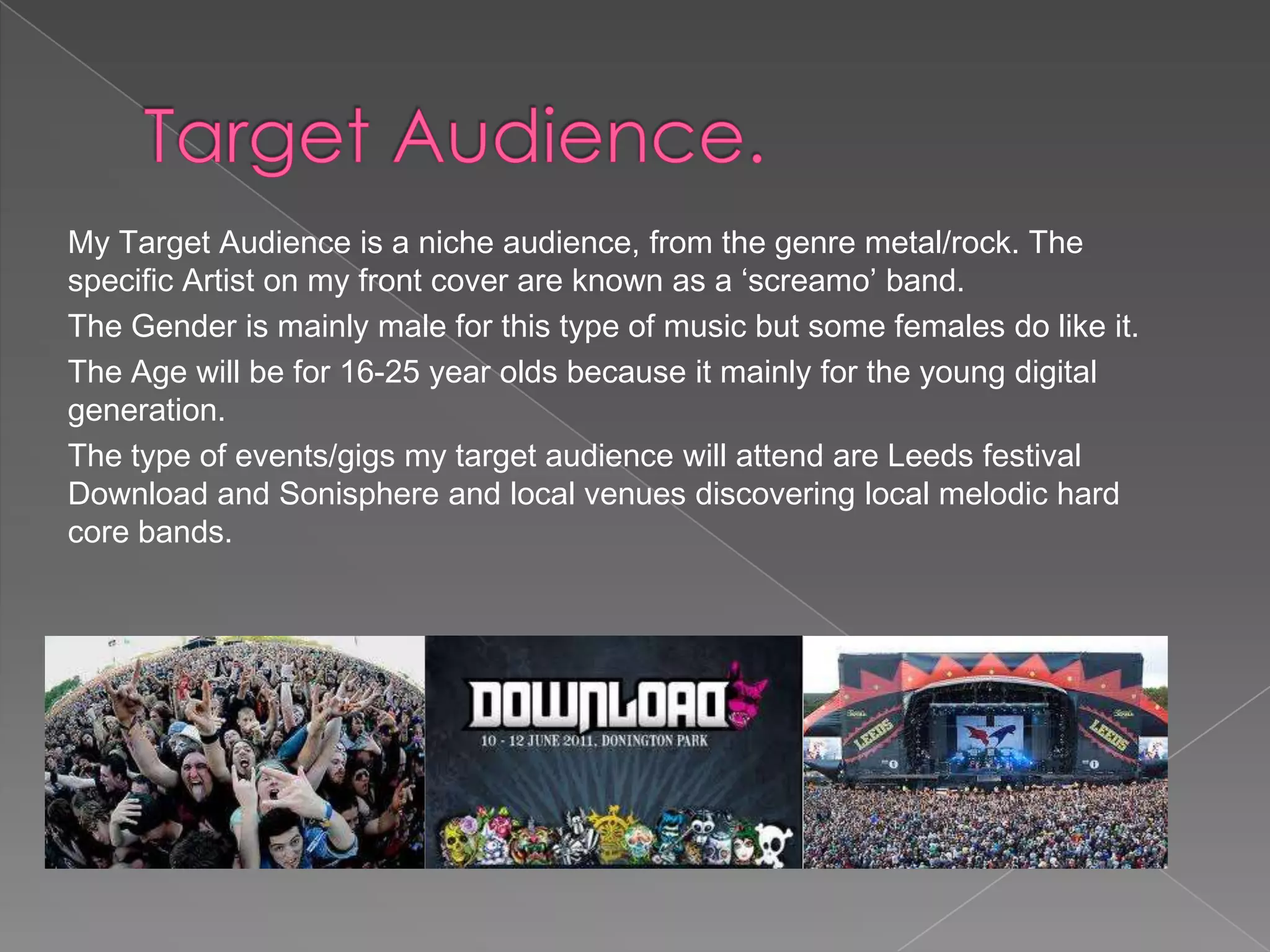 My target audience is males aged 16-25 who enjoy the metal/rock genre, specifically screamo bands. They attend festivals like Leeds and Download as well as local venues to discover up-and-coming melodic hardcore bands. The music has screaming vocals combined with melodic singing, fast drum beats, and complex guitar riffs. It is a popular but non-mainstream genre. The magazine will focus on both bigger bands and local self-taught bands, using red, yellow, and black colors and a sans serif font. It will be titled "Clash!" or "Riff!" and feature an interview with the writer's brother's melodic hardcore band based in Sheffield called AS Titans Fall.