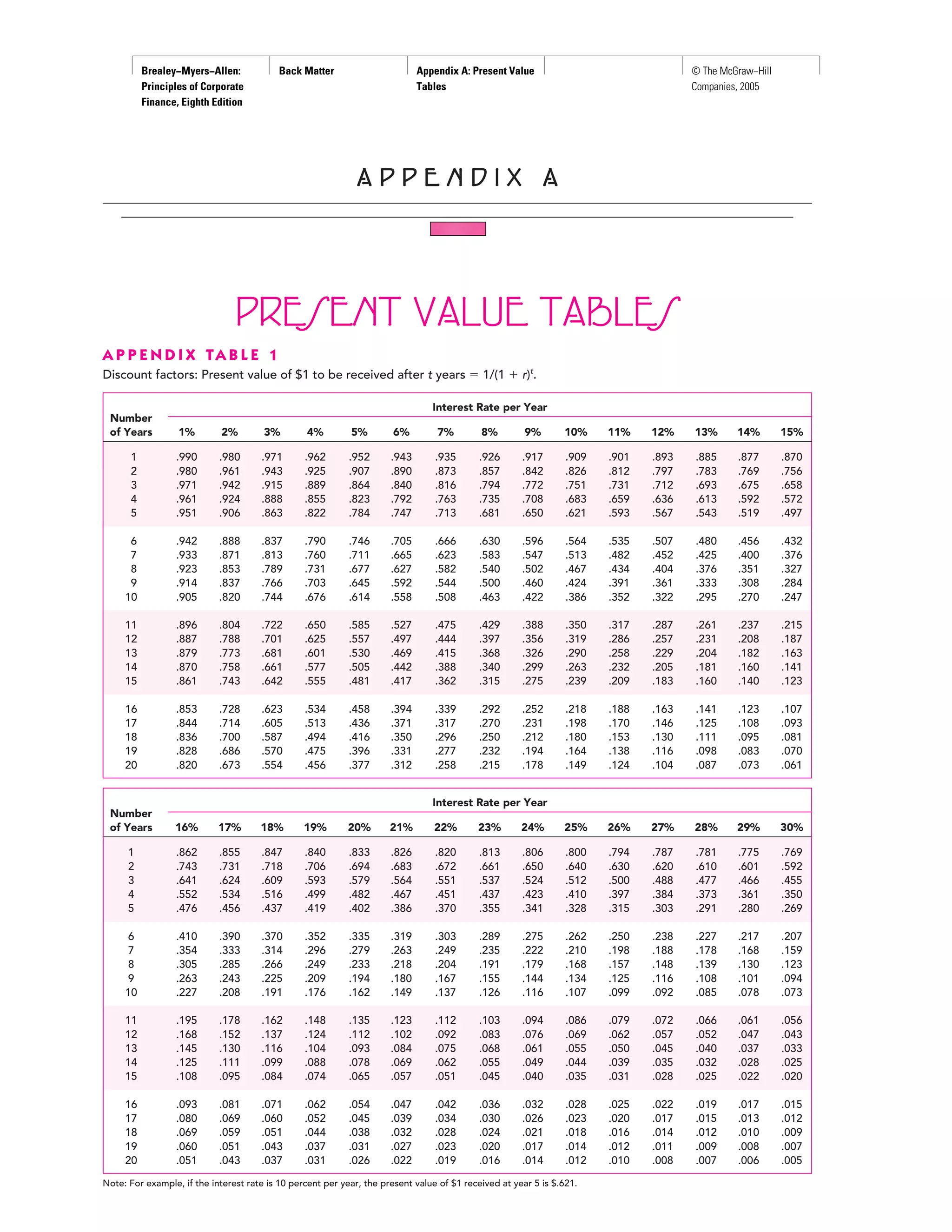This document contains tables presenting discount factors and future values for interest rates ranging from 1% to 30% per year over time periods from 1 to 30 years. Table 1 shows the present value of $1 received in the future, declining with longer time periods and higher interest rates. Table 2 shows the future value of $1, increasing with longer time periods and higher interest rates. The tables can be used to calculate the present or future value of a cash flow given an interest rate and number of time periods.