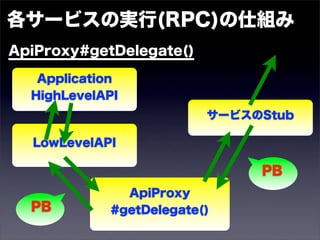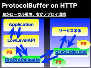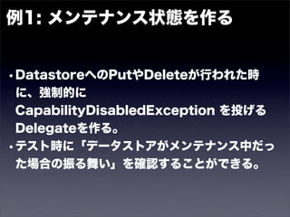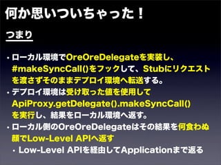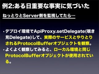 The document discusses code for making synchronous API calls in AppEngine. It defines a default delegate for API calls and overrides the makeSyncCall method to throw an exception for certain datastore Put calls. The code gets the service and method from HTTP request headers and writes the response bytes to the output stream. It also references a protocolBufferOnHttp method for making API calls over HTTP.
