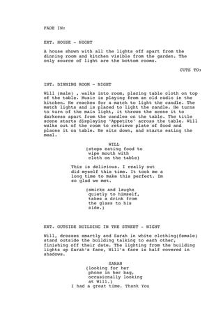 Will invites a woman named Sarah on a date and then to his home for dinner. However, his intentions are sinister - he kills Sarah and uses her body as the main ingredient in the meal he serves. After eating the meal, Will crosses Sarah's name off a list and calls another woman, Rachel, to invite her to dinner as well. The short film depicts Will as a serial killer who lures women on dates with the intention of killing and eating them.