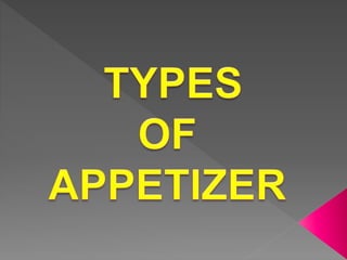 This document provides information and instructions for preparing different types of appetizers. It describes appetizers as small dishes served before the main course to stimulate appetite. Various appetizer options are outlined, including canapés made on bread bases, dips and spreads, fresh fruit platters, deep-fried, steamed, and grilled appetizers. Specific preparation methods and ingredients are detailed for canapés, crudités, and meat/cheese trays. Overall tips emphasize serving an appetizer variety, attractive plating, and balancing seasoning to enhance flavors.