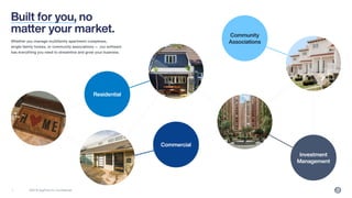 The document describes AppFolio's property management software, highlighting how it provides an integrated platform that streamlines operations across communication, accounting, maintenance, marketing, staffing, and management to allow property managers to focus on residents and owners. Key features include online portals, real-time reporting, automated workflows, robust accounting, an intuitive interface, and onboarding and ongoing support. Customer testimonials praise AppFolio's remarkable service, user experience, accounting capabilities, dynamic technology, and powerful workflows.