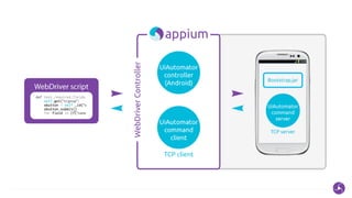 This document provides an overview and introduction to Appium, an open source test automation framework for use with native, hybrid and mobile web apps. It discusses Appium's architecture, how it works with different platforms, how to set it up locally or with Sauce Labs, and provides an example of running a sample test suite with Appium.