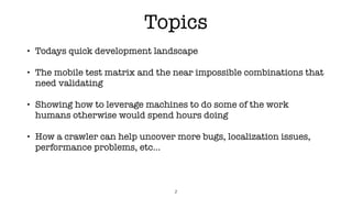 Justin Ison discusses the importance of automating mobile application testing using an app crawler at the Appium Conference 2019. He emphasizes the need for speed in development and presents the app crawler as a solution to manage the complexities of validating various mobile environments and to alleviate the burden on human testers. The presentation highlights the crawler's capability to emulate user interactions, capture metadata, and improve the overall testing efficiency in a fast-paced agile world.