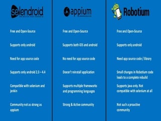 Appium is an open source tool for automating native, hybrid, and mobile web applications across multiple platforms including iOS and Android. It supports various programming languages and offers a modular architecture that facilitates flexible communication between clients and the server. However, it comes with some limitations, such as no support for Android versions lower than 4.2 and challenges in setting it up on some systems.