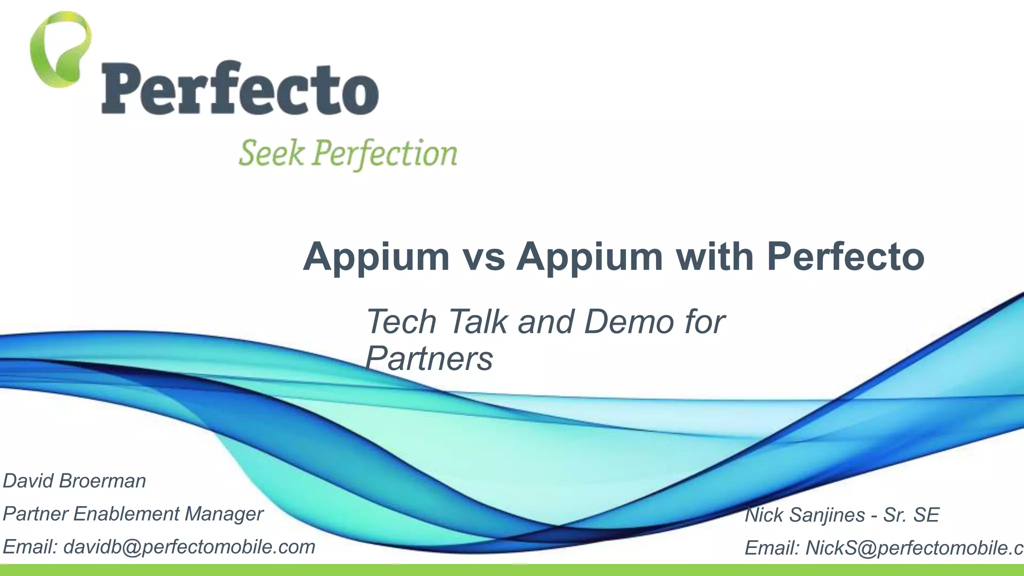The document discusses a tech talk and demo on Appium and Perfecto, focusing on automation testing and the integration of Selenium/Appium with Perfecto's cloud-based continuous quality lab. It outlines Perfecto's capabilities for testing mobile applications in real user conditions, highlighting its enterprise-level support and additional functionalities beyond standard automation tools. The agenda includes an introduction to Perfecto, types of mobile applications, setup instructions, and a demonstration of the testing process using various platforms and technologies.