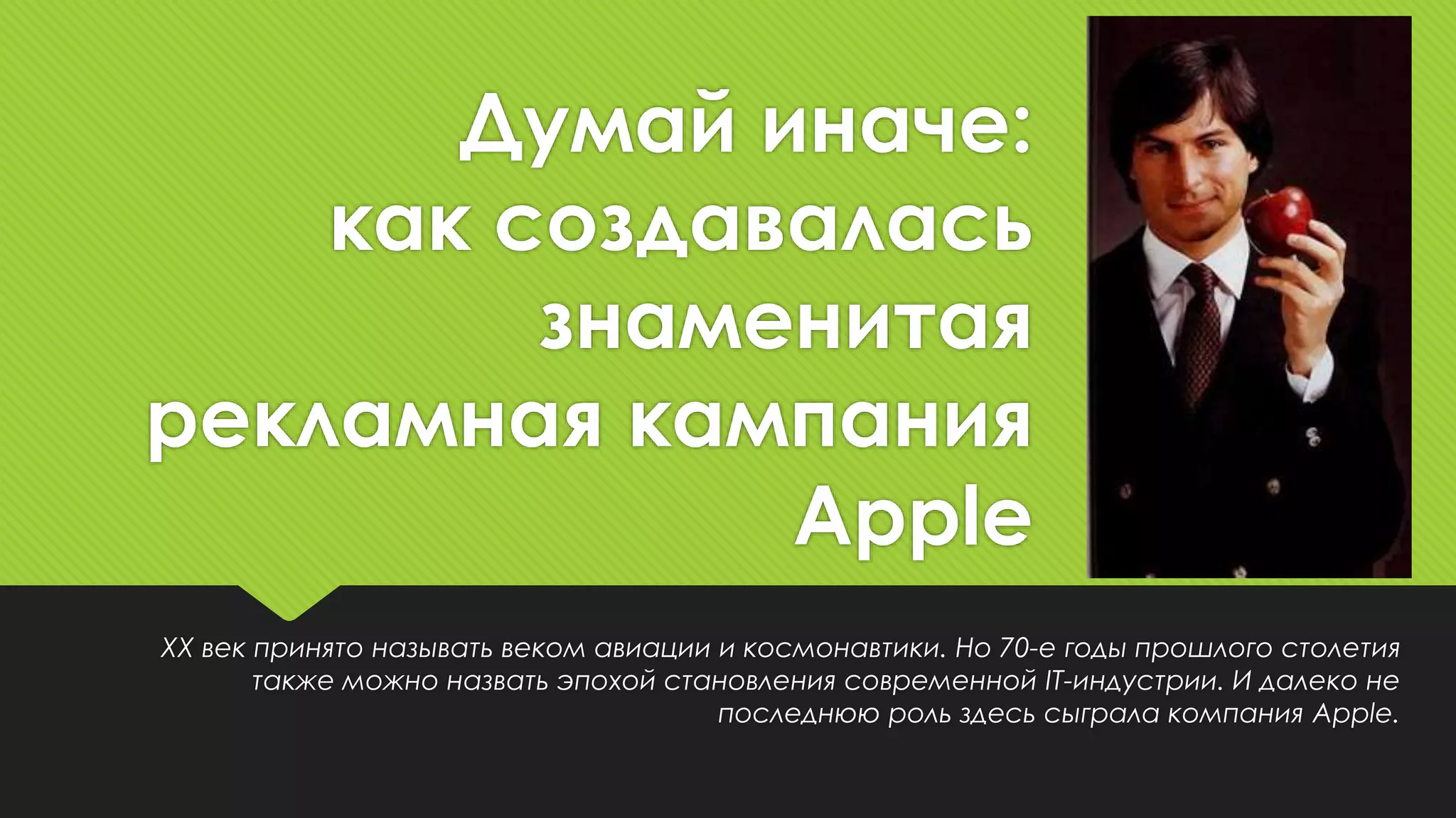 Документ описывает историю и развитие компании Apple, начиная с ее создания в 1976 году и до современных успехов, включая значимость рекламной кампании 'Think Different'. Основное внимание уделяется эволюции бренда, его дизайну и ключевым моментам, которые способствовали росту компании, несмотря на финансовые трудности в 1997 году. Реклама Apple, созданная под руководством Стива Джобса, акцентирует внимание на том, как технологии влияют на людей и их жизнь.
