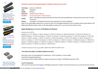 This document is a product listing for an Apple A1185 battery replacement on an online shopping website. It provides details about the battery such as the brand, price, specifications, compatibility, and maintenance tips. The battery has a capacity of 5600mAh and is compatible with several Apple MacBook Pro 13" models from 2001 to 2009. It comes with a 30-day money back guarantee and 1-year warranty. Tips are provided on proper storage, charging, and use of the battery to maximize its lifespan.