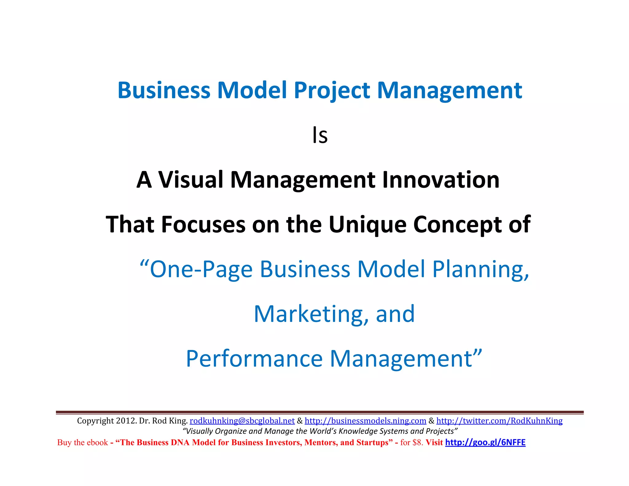 The document discusses business model project management, a visual innovation that enables effective planning, organizing, and managing of projects through a one-page dashboard approach. It emphasizes the elimination of rigid tools and incompatibility issues with traditional project management methods, promoting greater success, innovation, and efficiency. The primary focus is on the Business DNA model as a comprehensive tool for aligning organizational goals with project execution and performance.
