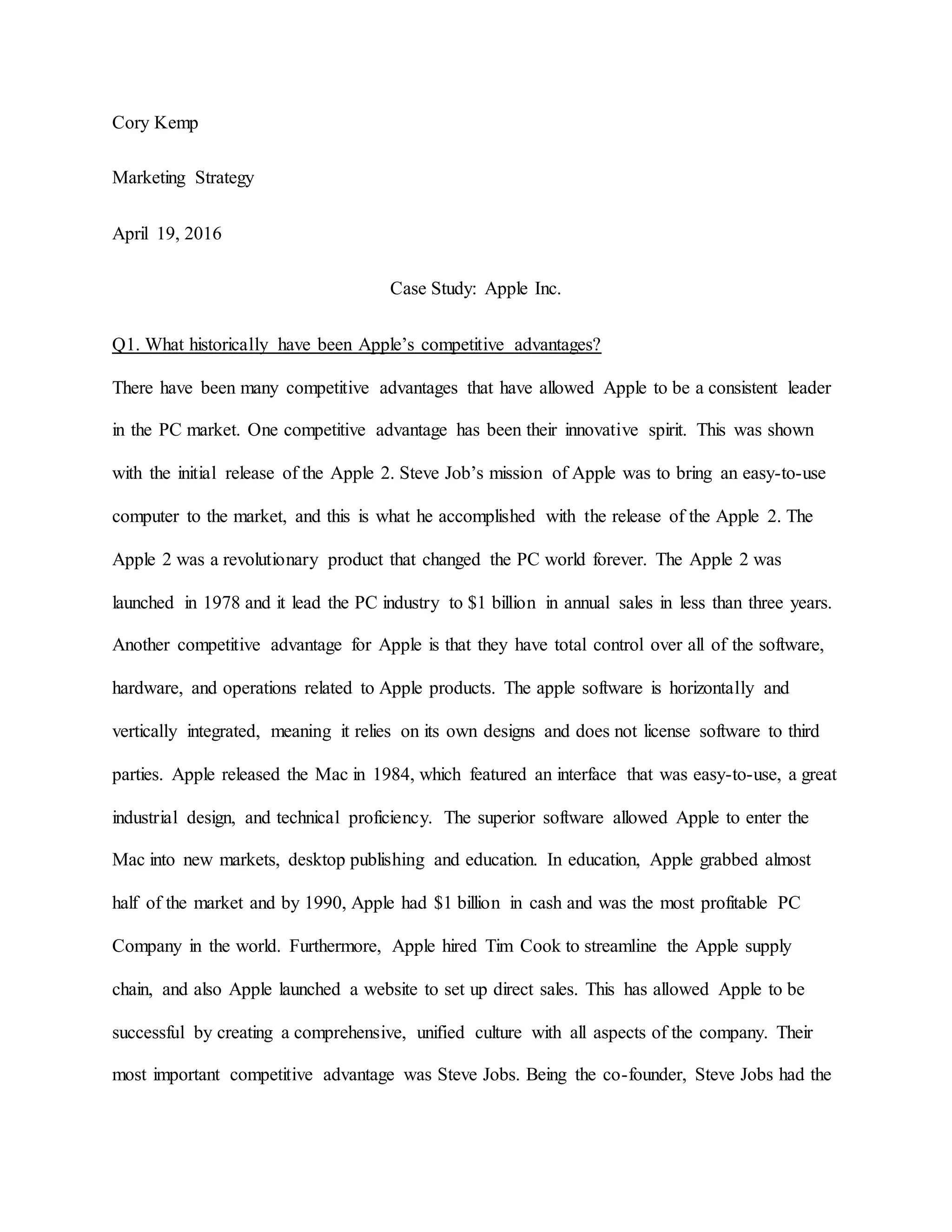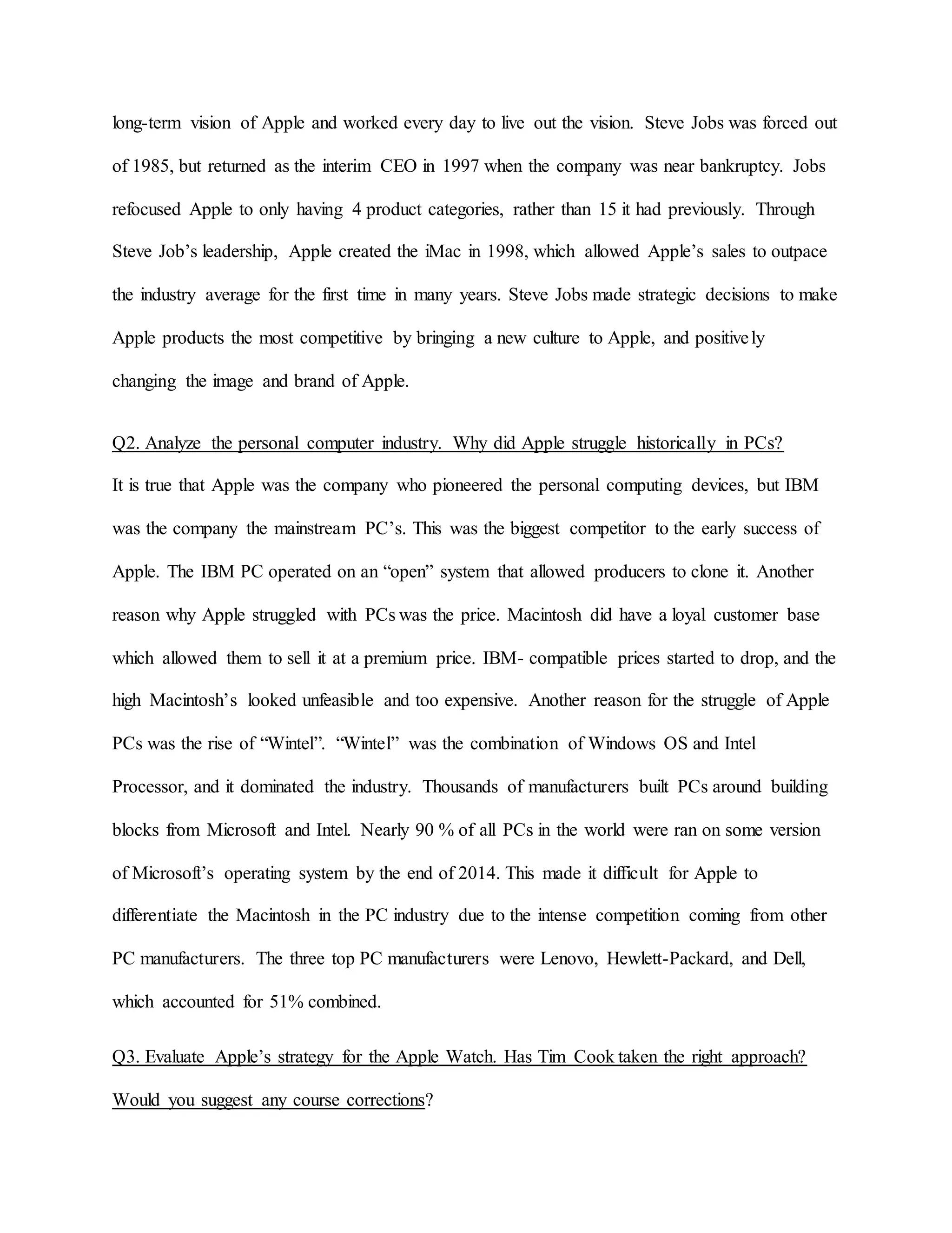 Historically, Apple's competitive advantages included their innovative spirit shown through products like the Apple 2 computer. They also had total control over their vertically integrated software and hardware. However, Apple struggled in the PC market due to IBM allowing PC cloning, higher Macintosh prices compared to cheaper IBM clones, and the rise of Windows-based PCs from many manufacturers. For the Apple Watch, Tim Cook has taken the right strategic approach in entering the emerging wearable market similarly to Jobs' "Digital Hub" strategy. However, the watch's limitations like only working with newer iPhones and short battery life could be improved.