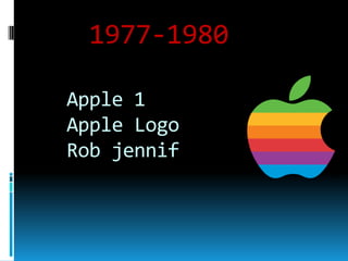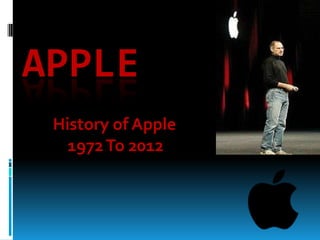 Apple was founded in 1977 and released the Apple I computer. Steve Jobs left Apple in 1985 but returned in 1996 to help turn the company around. Some key products Apple introduced included the Macintosh in 1984, iPod in 2001, iPhone in 2007, and iPad in 2010. These mobile devices helped Apple make a comeback and become the most valuable company in the world by 2012, when Steve Jobs stepped down as CEO before passing away that year.
