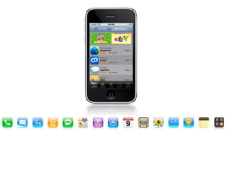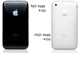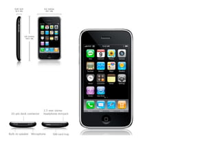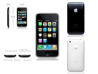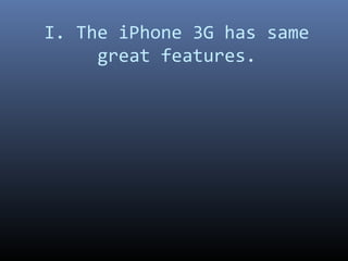 The document discusses the features of the iPhone 3G compared to the original iPhone. It has the same features as the original such as Visual Voicemail, Google Maps, a 2 megapixel camera, and access to the iTunes Store. However, the iPhone 3G also has newer features including 3G internet access that is 2.8 times faster, GPS, and improved accuracy for location services. Additionally, the iPhone 3G is available at a lower price point than the original iPhone, starting at $399 for the 8GB model.