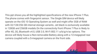 The iPhone 7 Plus is a 5.5-inch smartphone with iOS 10, a 12MP rear camera, 7MP front camera, 3GB of RAM, and internal storage options of 32/128/256GB. It has a fingerprint sensor and connectivity options including 4G LTE, Bluetooth 4.2, WiFi 802.11 a/b/g/n/ac, and USB 2.0. The phone is 188 grams and has a non-removable lithium-ion battery that provides up to 16 days standby time or 21 hours of talk time on 3G.