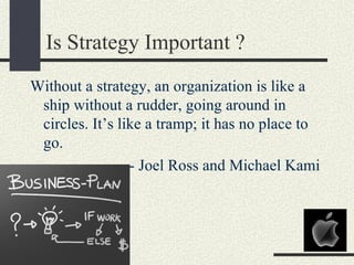 This document provides an overview of Apple Inc.'s business strategy presentation from February 2012. It discusses the importance of strategy, Apple's mission and vision, an analysis of Apple's external environment, industry, SWOT analysis, value chain, and long-term objectives. Apple's mission is to bring the best personal computing experience to users through innovative hardware, software and offerings, with a vision of being a leading innovator of new technologies that change daily life.