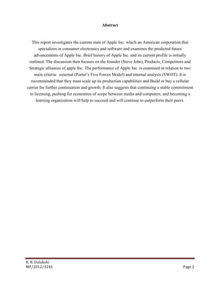 The report analyzes Apple Inc.'s history, current status, and future prospects, focusing on its innovative product development and strategic positioning. It highlights the company's strengths such as customer loyalty and its closed ecosystem, as well as weaknesses related to its premium pricing strategy and reliance on its founder, Steve Jobs. Recommendations include scaling production capabilities, enhancing partnerships, and fostering a learning organization to ensure continued success.