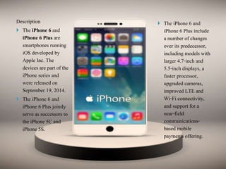The iPhone 6 and iPhone 6 Plus, released on September 19, 2014, are Apple's smartphones featuring larger displays, a faster processor, upgraded cameras, and enhanced connectivity. They introduced design elements influenced by the iPad Air and included significant camera improvements such as better low-light performance and enhanced autofocus. The devices run on iOS 8 and feature the new Apple A8 chip, along with various sensors for improved functionality.
