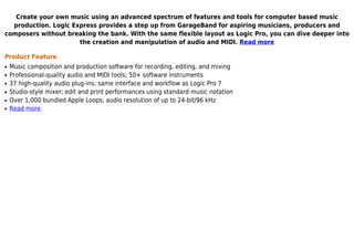 Logic Express 7.2 is music production software that provides professional-level audio and MIDI tools for aspiring musicians to create their own music, serving as a step up from GarageBand at a lower price than Logic Pro. It offers the same flexible interface as Logic Pro for in-depth audio and MIDI creation and manipulation, along with over 50 software instruments, 37 audio plugins, a studio-style mixer, Apple Loops, and the ability to edit and print music in standard notation.