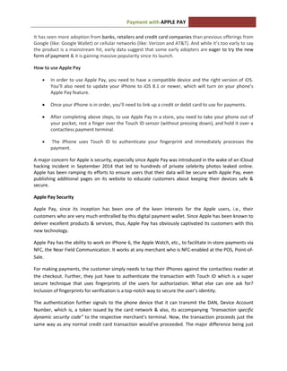 Apple Pay is a mobile payment and digital wallet service launched by Apple on October 27, 2014, allowing users to make payments using compatible devices like the iPhone 6 and Apple Watch. The service utilizes NFC technology for secure transactions and has partnered with many major banks, primarily available in the U.S. with international expansion planned. Apple Pay emphasizes security through touch ID authentication and tokenization, reducing the risk of exposing sensitive card information during transactions.