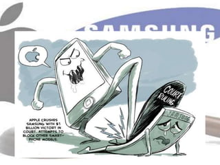 Apple sued Samsung for copying the design and user interface of the iPhone and iPad in several of Samsung's Android-based smartphones and tablets. Apple alleged that Samsung infringed on various Apple patents related to tap-to-zoom functionality, pinch-to-zoom gestures, and the graphical user interface. The case went to trial, and the jury found Samsung guilty of infringing on Apple's design patents and awarded Apple $1 billion in damages. However, Samsung plans to appeal the verdict and claims the ruling is not final.