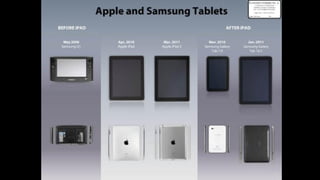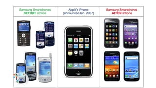 The document compares the innovation of Apple and Samsung, detailing significant product introductions and highlighting legal disputes over design similarities. Apple asserts that Samsung copied various design elements and functionalities, leading to a lawsuit where Samsung was ordered to pay Apple $1.05 billion. The author concludes that Apple is more innovative than Samsung.
