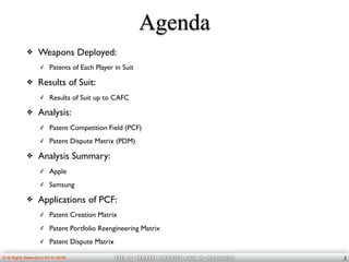 The document discusses the patent litigation between Apple and Samsung, analyzing the patents involved, results of the lawsuits, and the competitive strategies deployed by both companies. It highlights Apple's challenges in defending its patents and Samsung's reliance on standard patents that are vulnerable to counterattacks. The analysis also includes suggestions for improving patent strategies for both parties.