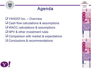 This document provides an analysis of Yahoo! Inc. for valuation purposes. It includes: