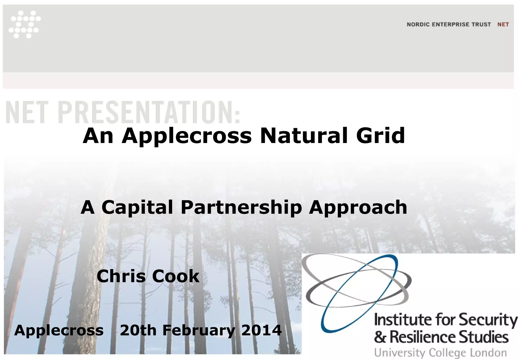 This document proposes a Natural Grid and Open Capital approach to achieve resilient Market 3.0. It discusses how Denmark achieved resource resilience through a Natural Grid policy focusing on least energy cost over time. This decentralized their energy system and led to energy security. It also proposes a prepay model for land and energy where consumers prepay for future access in exchange for an interest-free loan, aligning stakeholder interests sustainably over time. An Applecross Green Deal is outlined using this approach through an energy pool investing in community projects repaid via consumer energy prebuys.